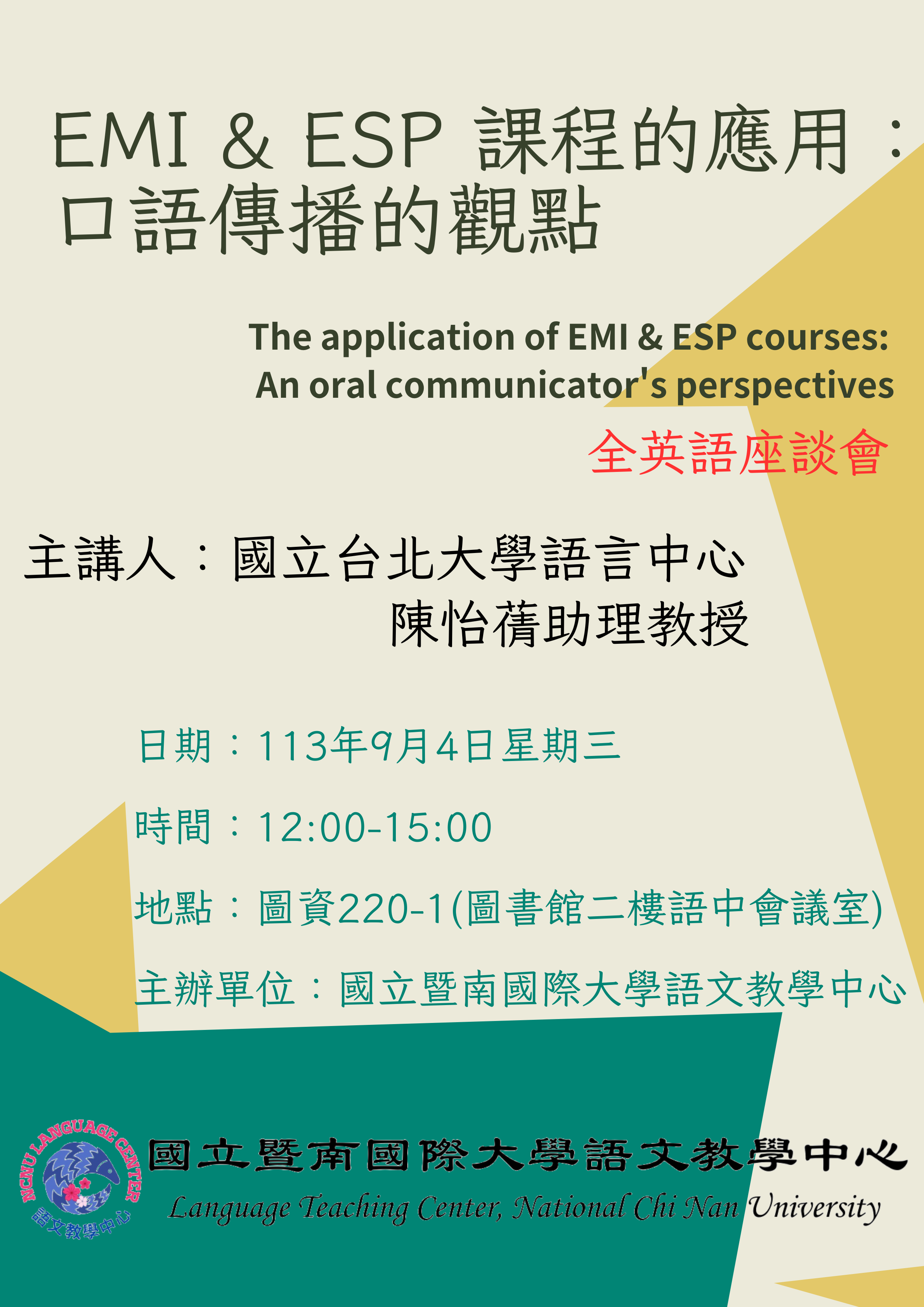 【語文中心】113-1 EMI & ESP 課程的應用:口語傳播的觀點(全英語座談會)