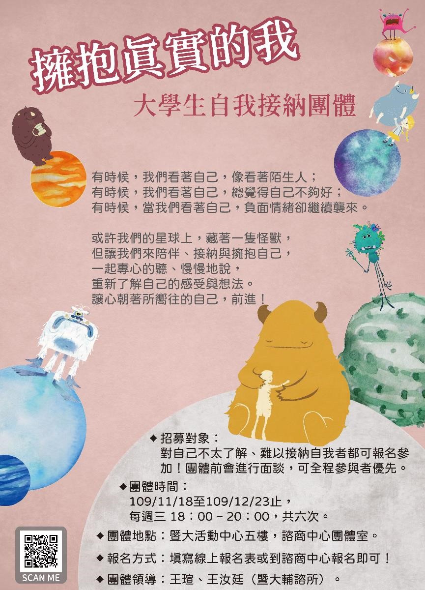 【招募對象】:18-24歲大學生為主,對自己不太了解、難以接納自我者都可報名參加!