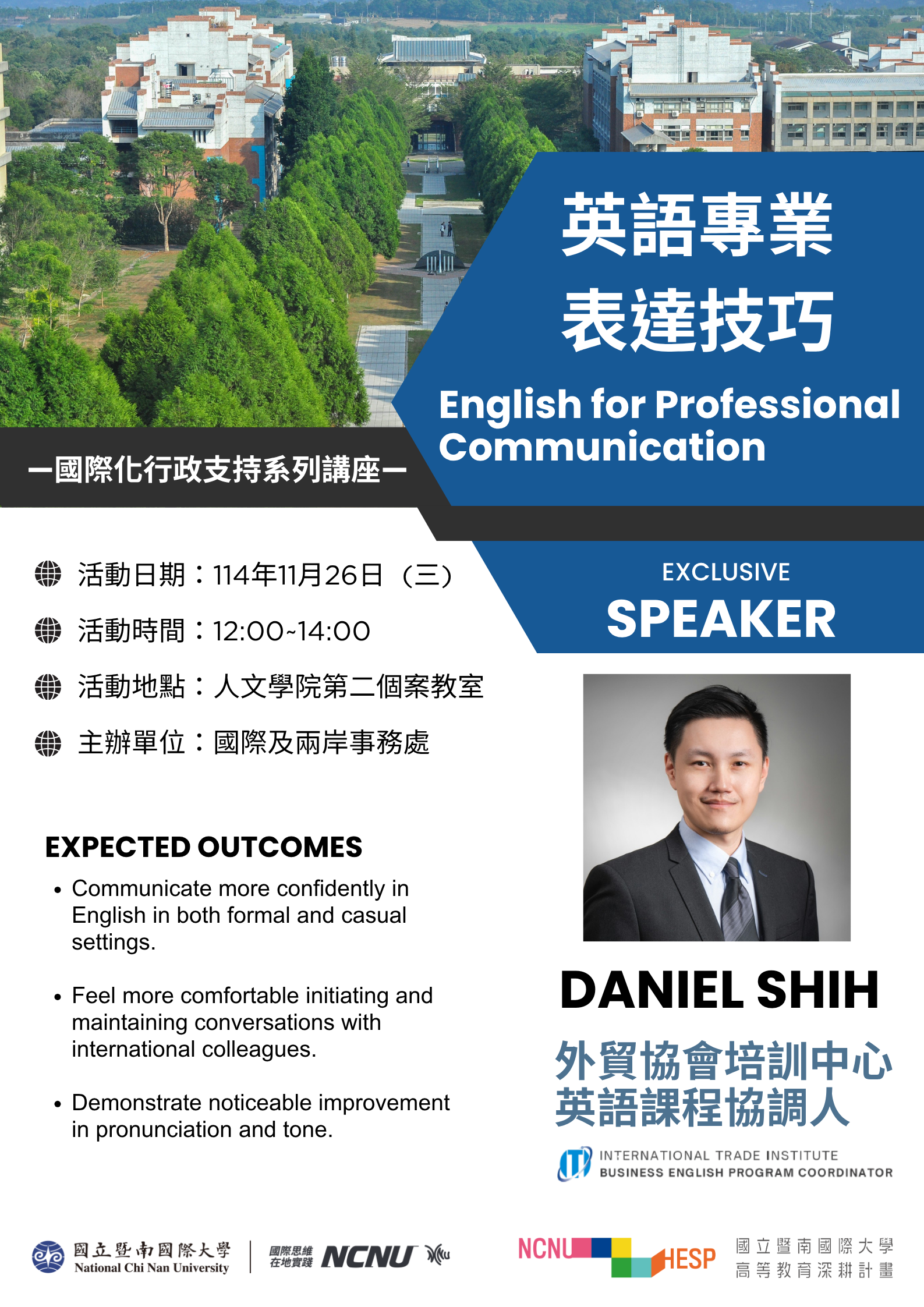本講座特邀外貿協會(ITI)英語課程協調人Daniel Shih老師,課程旨在協助學員強化專業場合中的英語口語表達能力。課程聚焦於溝通核心技巧:如何組織想法、提升表達影響力、掌握語調運用與培養流暢度。透過實作與練習,參與者將能更具自信,並熟悉一套可立即運用於與國際夥伴及大學同儕交流的實用英語表達。